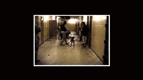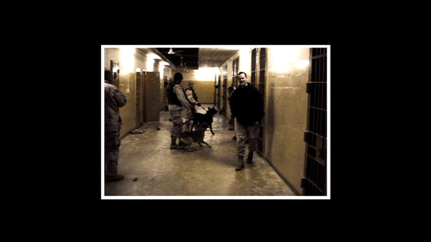 [SABRINA HARMAN, SPECIALIST MILITARY POLICE] This is the first time I've seen military police dogs here. Two dogs with two owners go to a man against the wall. The guy is scared out of his mind. The dogs get closer.