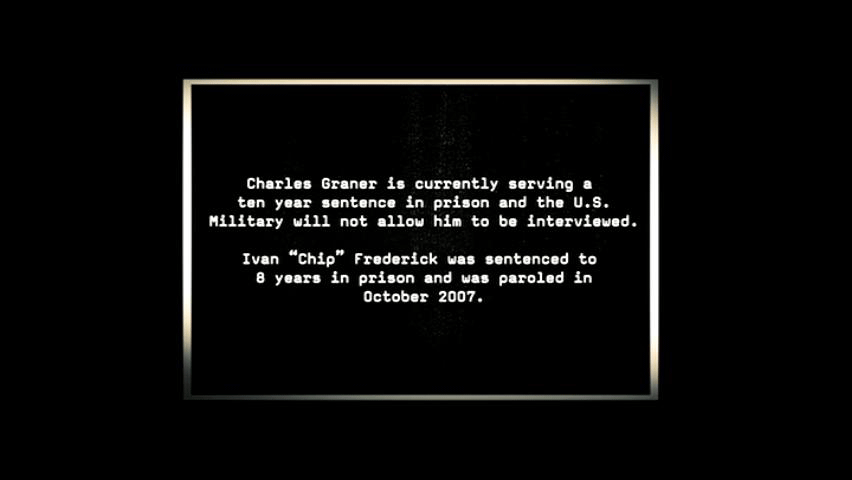 Within five or ten minutes after sun-up millions of frickin' birds took off out of the date palms and just blacked out the sunrise to the east where I'm lookin'. And they fly north, northwest to go over the top corner of the post. And I'd try to get out of my booth, or take a break, a cigarette break, around sunset, because those birds came back every night about 30 minutes, 15 minutes before sunset, and landed back in the date palms. So I started my day every day at least watching those guys, the birdies take off, and at least thinking something in the world was still normal. They could fly away from Abu G. They came back every night, but they could fly away every morning. It helped deal with the weirdness. Charles Graner is currently serving a ten year sentence in prison and the U.S. Military will not allow him to be interviewed. Ivan "Chip" Frederick was sentenced to 8 years in prison and was paroled in October 2007. No one above the rank of Staff Sergeant has served time in prison for the abuses at Abu Ghraib. INTERVIEWEES JAVAL DAVIS,
