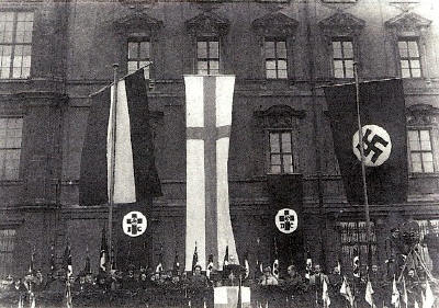 Artist's Comment The hooked cross (swastika) placed in the center of the traditional symbol of Christianity, was adapted by the protestant "German Christian Movement" (Deutsche Christen or short D.C.) as their symbol. As a group within the German Protestant Church it was openly endorsed by the Nazi party. Dominating in 1933 the unifying process of the 29 regional churches into the Protestant Reich Church. The Deutsche Christen managed to get Ludwig Muller, one of their own ,elected "Reich Bishop". One of their credos: