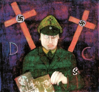 Chaplain's famous 1940 film, "The Great Dictator." In this painting, the image of Party Member and Church official are blended, as indicated by the cross on the hat. "D" and "C" appear as a visual text. The image of the official holds two photos showing activities by the Church in service to the Nazis. Hirschberger this has blended his own interpretation with the reality of the documentary photograph. Charlie Chaplain's 1940 American film, "The Great Dictator," used the symbol of "the double cross" for the flag of the Hitler look-alike. In English, the word "doublecross" has meaning, which relates to the treachery of the Nazis and the false promises that ultimately led to the destruction of Germany as well as its victims. |