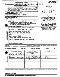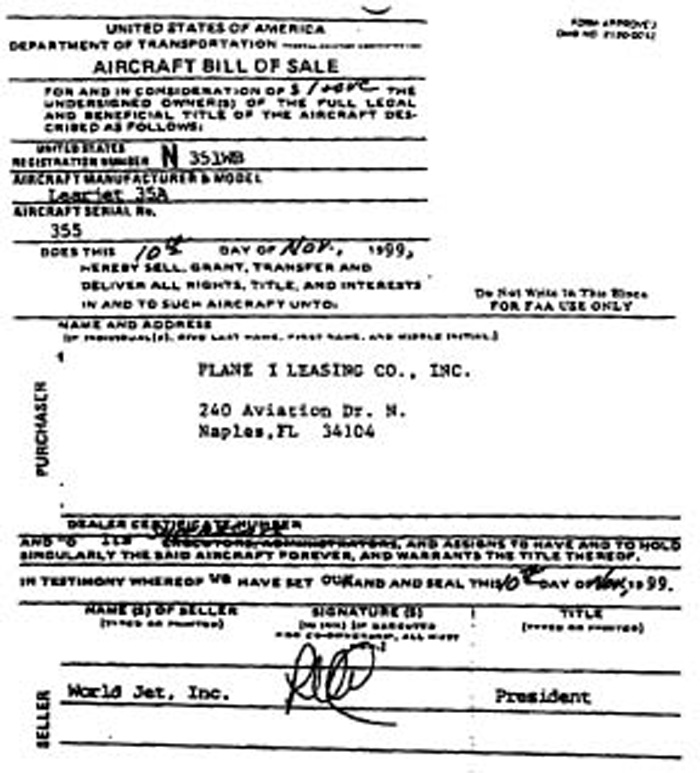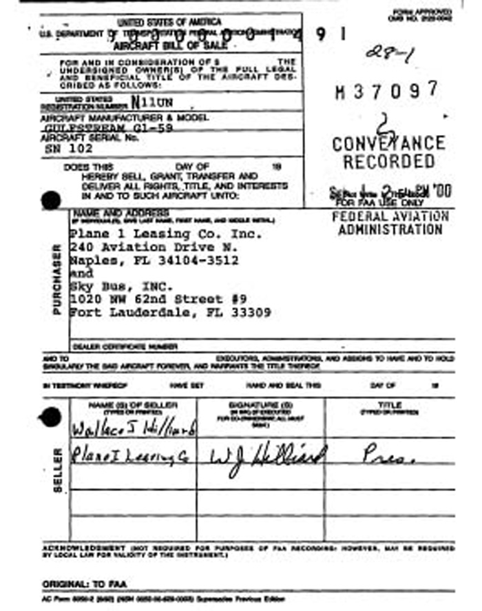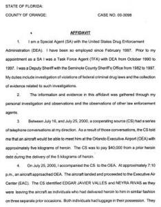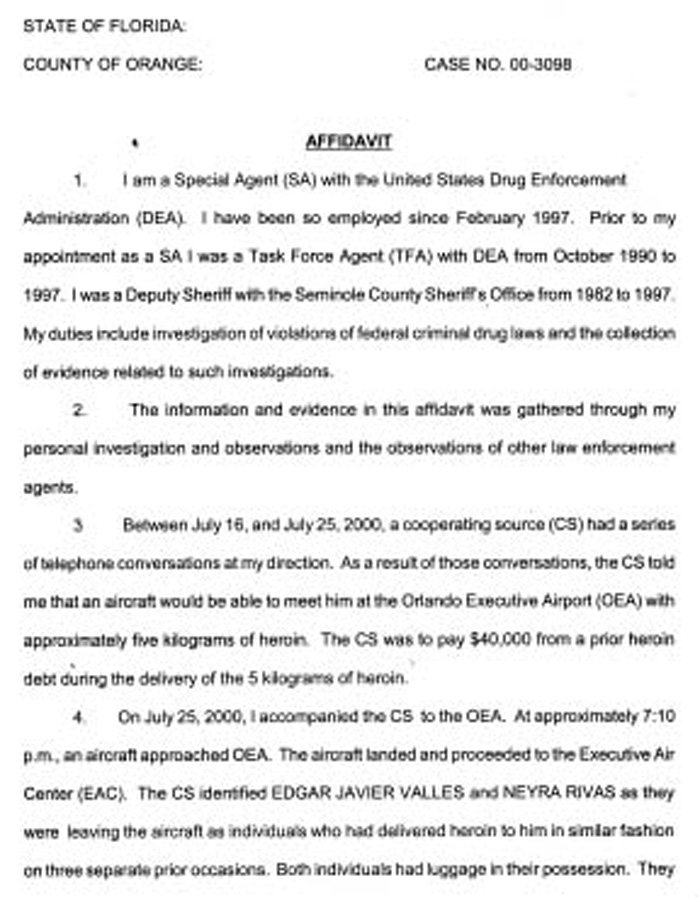 `Retired insurance executive' Wally Hilliard, who purchased a fleet of 30-40 planes after retiring to Florida, including several Lear jets like this one. DEA affidavit on the biggest seizure of heroin in central Florida history, found on Hilliard's Lear jet. STATE OF FLORIDA, COUNTY OF ORANGE CASE NO. 00-3098 AFFIDAVIT 1. I am a Special Agent (SA) with the United States Drug Enforcement Administration (DEA). I have been so employed since February 1997. Prior to my appointment as a SA, I was a Task Force Agent (TFA) with DEA from October 1990 to 1997. I was a Deputy Sheriff with the Seminole County Sheriff's Office from 1982 to 1997. My duties include investigation of violations of federal criminal drug ___ and the collection of evidence related to such investigations. 2. The information and evidence in this affidavit was gathered through my personal investigation and observations and the observations of other law enforcement agents. 3. Between July 16, and July 25, 2000, a cooperating source (CS) had a series of telephone conversations at my direction. As a result of those conversations, the CS told me that an aircraft would be able to meet him at the Orlando Executive Airport (OEA) with approximately five kilograms of heroin. The CS was to pay $40,000 from a prior heroin debt during the delivery of the 5 kilograms of heroin. 4. On July 25, 2000, I accompanied the CS to the DEA. At approximately 7:10 p.m., an aircraft approached DEA. The aircraft landed and proceeded to the Executive Air Center (EAC). The CS identified EDGAR JAVIER VALLES and NEYRA RIVAS as they were leaving the aircraft as individuals who had delivered heroin to him in similar fashion on three separate prior occasions. Both individuals had luggage in their possession. They were detained as they approached the building at the EAC. 5. The luggage in possession of these individuals was searched at my direction. In the luggage were located certain forms of foot apparel which were similar to those previously associated with the CS and which each contained approximately one quarter to one half kilogram of heroin. I directed that one of the items be opened. Inside the item was a quantity of a white substance which appeared to be heroin and which field tested positive for heroin. The luggage which was taken off the aircraft contained approximately five kilograms of heroin. 6. The aircraft in which these individuals had traveled to Orlando is a white Lear Jet Model 35 with identification number N351WB on its tail assembly. The air crew, consisting of a pilot, copilot and flight attendant, and one other passenger were interviewed at the scene. These individuals stated that the Lear jet is a charter aircraft which had picked up the passengers in Caracas, Venezuela earlier on July 25, 2000. The jet was then flown to Ft. Lauderdale, Florida, and then to Orlando. 7. After RIVAS and VALLES-DIAZ were taken into custody, agents and uniformed officers approached the Lear Jet. As agents approached the aircraft DIEGO LEVINE-TEXAR, the pilot of the aircraft, frantically attempted to make a telephone call using a cellular telephone. LEVINE-TEXAR ignored agents and police officers who repeatedly ordered him to drop the telephone. Agents had to physically remove the telephone from LEVINE-TEXAR's hands. Agents then secured the remaining individuals on the aircraft. Based on my experience I know that narcotics traffickers and their associates maintain frequent contact with each other while transporting narcotics and currency. I believe that LEVINE-TEXAR attempted to contact other accomplices as to the presence of agents and other law enforcement officials. 8. DEA SA Rob Patterson interviewed LEVINE-TEXAR, who stated that he has known VALLES-DIAZ for approximately 9 months. He has flown VALLES-DIAZ to New York and Fort Lauderdale from Venezuela approximately 30 times during that time. LEVINE-TEXAR said that he and his company were paid a total of $500,000 for those trips and that he was going to be paid $50,000 for the current trip after arriving in Orlando. 9. DEA SA Steve Collins interviewed VALLES-DIAZ. VALLES-DIAZ told agents that he has known LEVINE-TEXAR for approximateloy 15 years. VALLES-DIAZ told agents that LEVINE-TEXAR has flown him to New York numerous times. VALLES-DIAZ told agents that LEVINE-TEXAR was introduced to VALLES-DIAZ' sources for heroin supply in Venezuela. According to VALLES-DIAZ, he told LEVINE-TEXAR that they were involved in the meat business. 10. On July 25, 2000 DEA TFA Burlin Webster interviewed NEYRA RIVAS. She told TFA Webster that she had accompanied VALLES-DIAZ from Venezuela to the United States to assist in the distribution of heroin. 11. On July 25, 2000 a search warrant was obtained for the aircraft. A search of the aircraft and its contents revealed approximately 8 additional kilograms of heroin hidden in several pairs of shoes and sandals stored in three separate suitcases. 12. LEVINE-TEXAR told U.S. Customs SA Tony Howell that he was introduced by VALLES-DIAZ to Ramon Cacho. LEVINE-TEXAR said that Cacho was VALLES-DIAZ' business-associate from Puerto Rico. LEVINE-TEXAR said that VALLES-DIAZ and Cacho hired him to fly routes from Caracas, Venezuela, to Puerto Ayacucho, Provo, Turk Caico, Ft. Lauderdale, and New Jersey and return. Hilliard's partners in American Jet Charters included the pilot, suspected by the DEA of being involved but never charged, as well as a Venezuelan currently incarcerated. Hilliard's Lear jet was supplied to him by the same source that years earlier supplied a Lear to the man called the "biggest drug smuggler in American history," Barry Seal. Aviation crime. Notice of seizure of Hilliard's Lear. (top.) Another Lear jet flown to Naples by Hilliard's chief pilot was suspected of having been stolen in Canada. In business with the CIA? Hilliard owns jets worth tens of millions with a Miami man, Mark Shubin, who was a CIA U-2 pilot over Russia. UN planes? The registration numbers of s