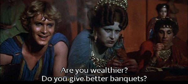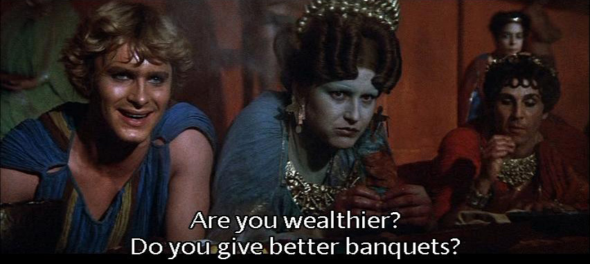 Are you wealthier? Do you give better banquets? Blockhead, scoundrel, tramp. You dare laugh? Are you a cavalier? That would make me the emperor's son! Did Papa buy you a goat? |