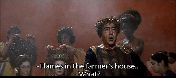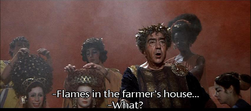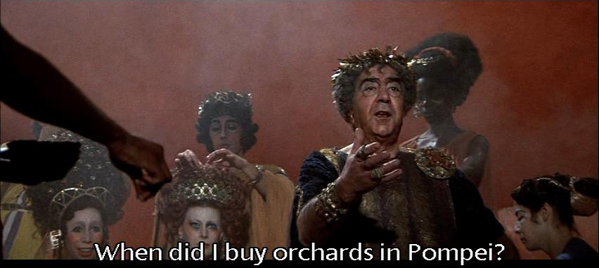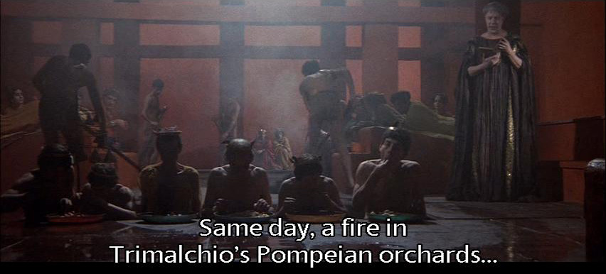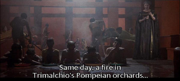 Same day, a fire in Trimalchio's Pompeian orchards ...