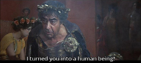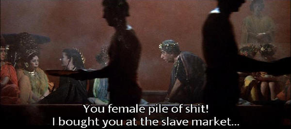[Fortunata] I can't believe you're carrying on like this right in front of me! [Trimalcione] You female pile of shit! I bought you at the slave market ... I turned you into a human being! |