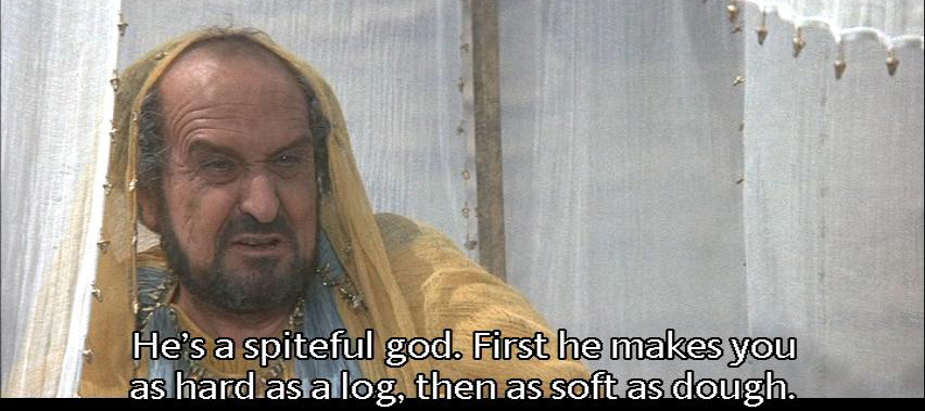 He's a spiteful god. First he makes you as hard as a log, then as soft as dough.