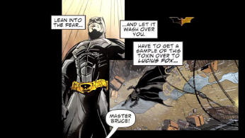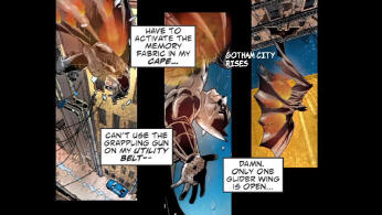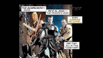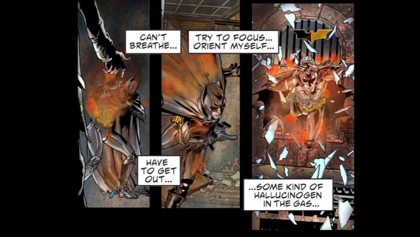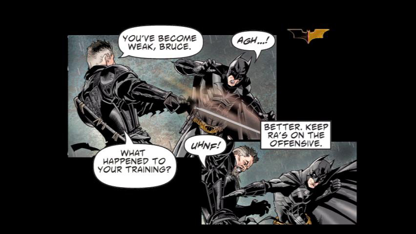 Begins -- Illustrated Screenplay & Screencap Gallery THE JOURNEY BEGINS. [Scarecrow] Boo! [WKKRASH FSSSSSSS] ]Batman] hck -- nnghh Can't breathe ... try to focus ... orient myself ... have to get out ... some kind of hallucinogen in the gas ... GOTHAM CITY RISES. Have to activate the memory fabric in my cape ... Can't use the grappling gun on my utility belt -- Damn. Only one glider wing is open ... Protective body armor absorbed the impact ... Still hurts like hell ... Fire-resistant body armor kept the flames at bay. Need to get to the Tumbler. [Scarecrow] Going somewhere, Batman? [Batman] Throat burns ... Can't breathe ... Hua-coughggh! Some kind of toxin ... The scarecrow -- again. Ra's Al Ghul -- The Demon's head. Even Carmine Falcone ... Are they all in this together? [Ducard] You've become weak, Bruce. What happened to your training? [Batman] Agh ...! [Ducard] UHNF! [Batman] Better. Keep Ra's on the offensive. Falcone can't be here -- he's supposed to be in Arkham. Have to tell Gordon ... RAchel, as well. If Falcone's escaped, she's in danger. [Scarecrow] You're a cliche, Batman. [Batman] This is not right. None of it is real. [Scarecrow] Like you were ripped from the pages of a psych textbook. A Jungian archetype come to life ... The shadow made flesh! [Batman] Must still be under the influence of the toxin ... Just hold your ground. Lean into the fear ... and let it wash over you. Have to get a sample of this toxin over to Lucius Fox ... [Alfred] Master Bruce! Are you alright? [Batman] I'm fine now, Alfred. [Scarecrow] All creatures fear flame ... Even Bats!