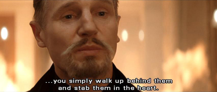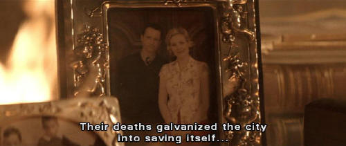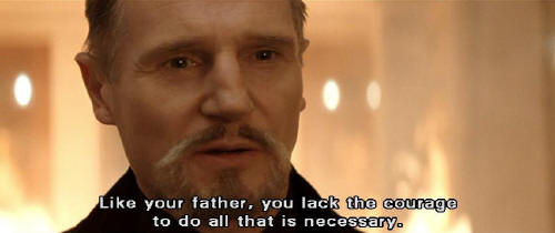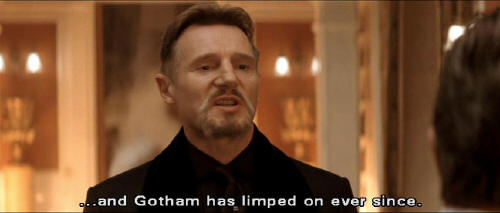 Their deaths galvanized the city into saving itself, and Gotham has limped on ever since. We are back to finish the job. And this time no misguided idealists will get in the way. Like your father, you lack the courage to do all that is necessary. If someone stands in the way of true justice, you simply walk up behind them and stab them in the heart.