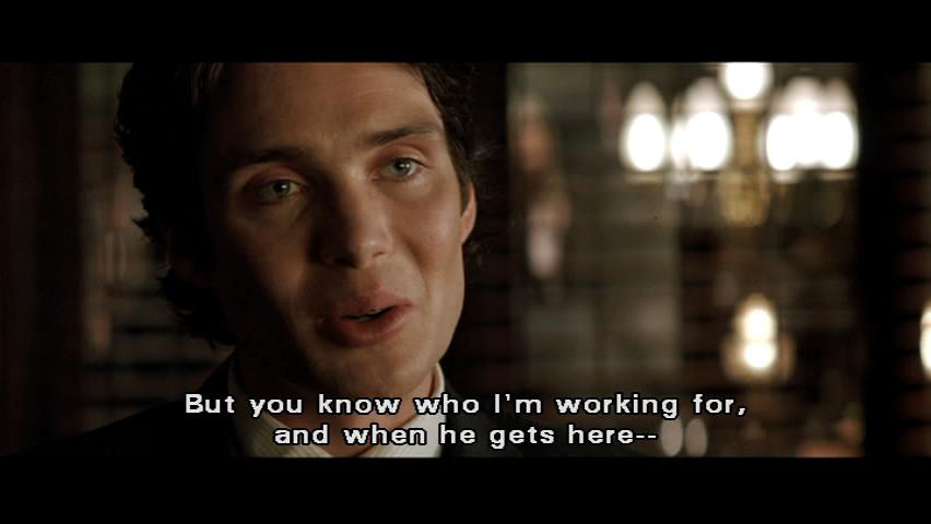 But you know who I'm working for, and when he gets here -- [Falcone] He -- He's coming to Gotham? [Crane] Yes, he is. And when he gets here, he's not going to wanna hear ... that you have endangered our operation just to get your thugs out of a little jail time. [Falcone] Who's bothering you? [Crane] There's a girl at the DA's office. [Falcone] We'll buy her off. [Crane] Not this one.