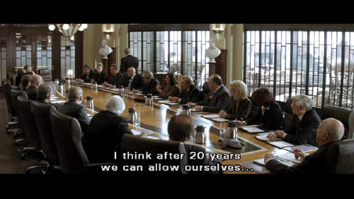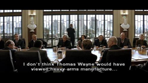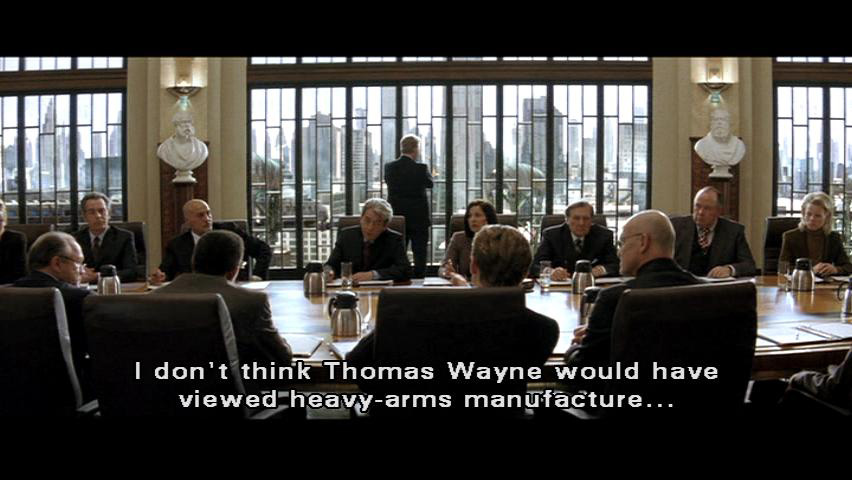 [Fredericks] I don't think Thomas Wayne would have viewed heavy arms manufacture ... as a suitable cornerstone for our business. [Earle] Well, that's 20 years ago, Fredericks. I think after 20 years we can allow ourselves ... to stop thinking about what Thomas Wayne would have done. [Secretary] Good morning, Mr. Earle's office.