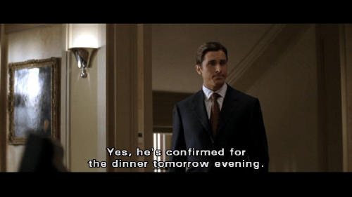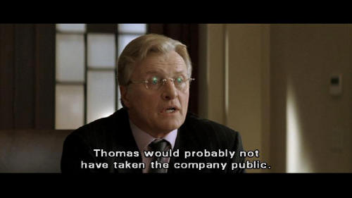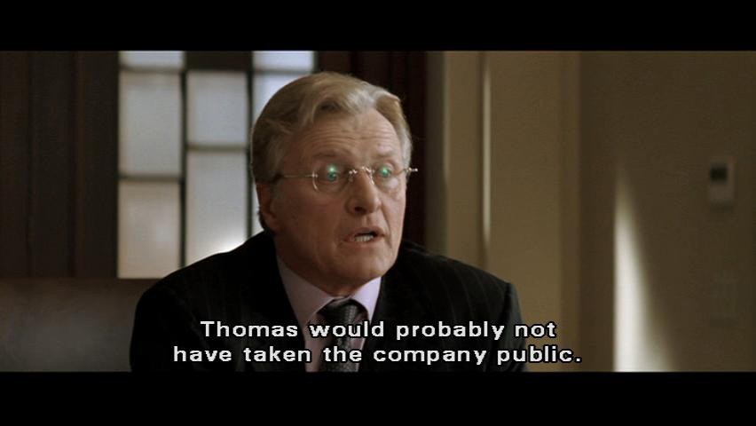 Yes, he's confirmed for the dinner tomorrow evening. [Bruce] Good morning. I'm here to see Mr. Earle. [Secretary] Name? [Bruce] Bruce Wayne. [Earle] Thomas would probably not have taken the company public.