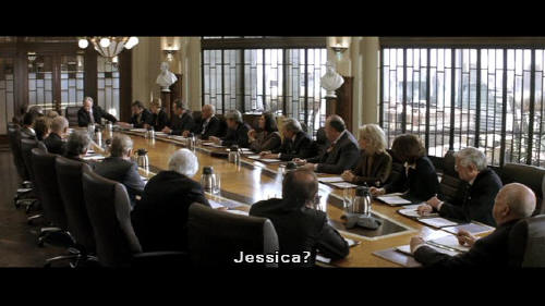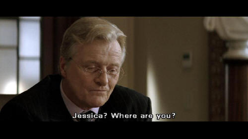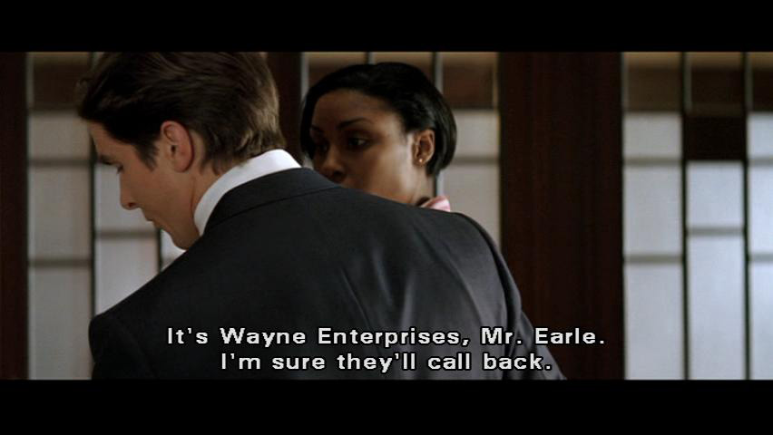 But that is what we, as responsible managers, are going to do. Jessica? Jessica? Where are you? [Bruce] Eye on the ball, and ... [Earle] Why is no one answering the phone? [Bruce] It's Wayne Enterprises, Mr. Earle. I'm sure they'll call back. [Earle] Bruce? You're supposed to be dead.