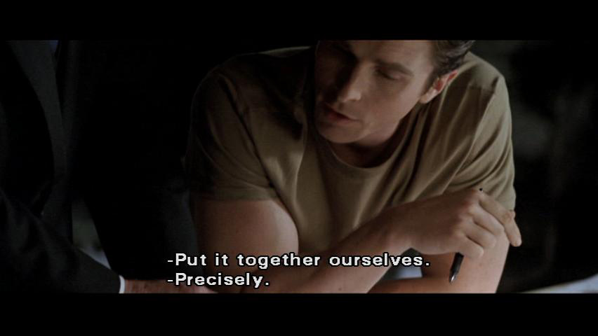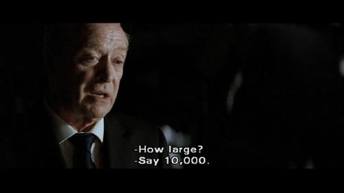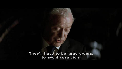 [Alfred] Indeed. And then, quite separately ... we place an order to a Chinese company for these. [Bruce] Put it together ourselves. [Alfred] Precisely. They'll have to be large orders, to avoid suspicion. [Bruce] How large? [Alfred] Say 10,000. [Bruce] Well, at least we'll have spares. [Alfred] Yes.