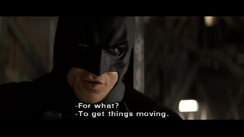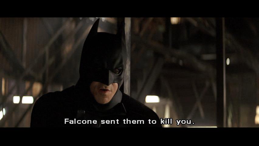 [Batman] Falcone sent them to kill you. [Rachel] Why? [Batman] You rattled his cage. [Rachel] What's this? [Batman] Leverage. [Rachel] For what? [Batman] To get things moving. [Rachel] Who are you?