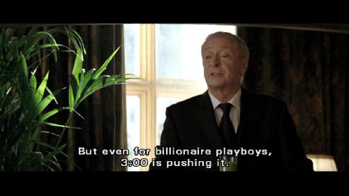 [Bruce] Bats are nocturnal. [Alfred] Bats may be. But even for billionaire playboys, 3:00 is pushing it. The price for leading a double life, I fear. Your theatrics made an impression.