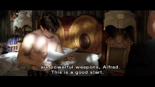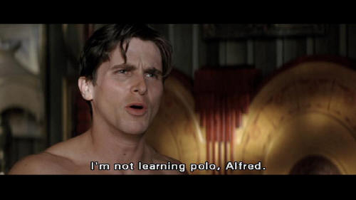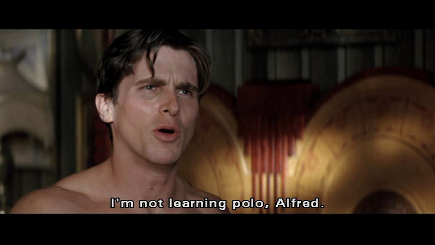 [Bruce] Theatricality and deception ... are powerful weapons, Alfred. This is a good start. [Alfred] If those are to be the first of many injuries to come ... it would be wise to find a suitable excuse. Polo, for instance. [Bruce] I'm not learning polo, Alfred.