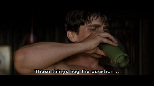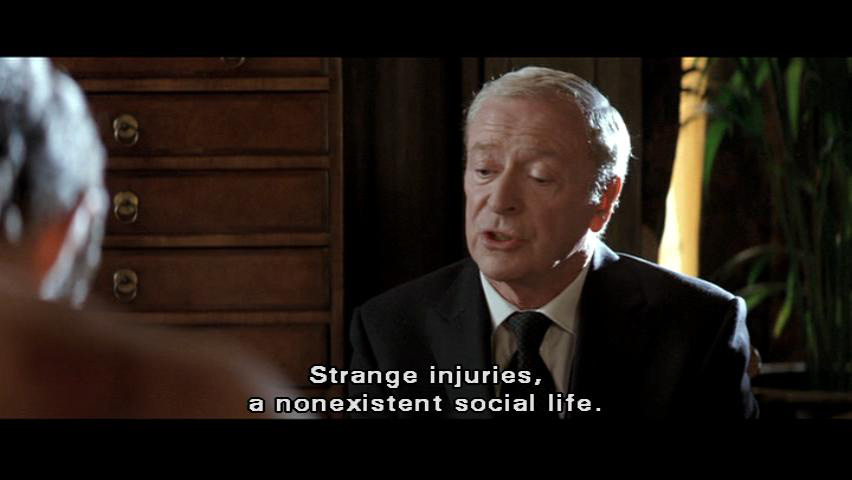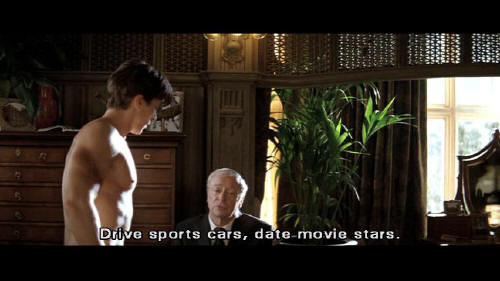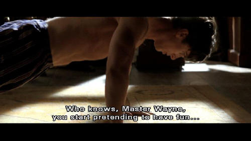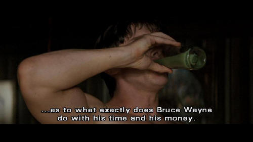 [Alfred] Strange injuries, a nonexistent social life. These things beg the question ... as to what exactly does Bruce Wayne do with his time and his money. [Bruce] What does someone like me do? [Alfred] Drive sports cars, date movie stars. Buy things that are not for sale. Who knows, Master Wayne, you start pretending to have fun ...