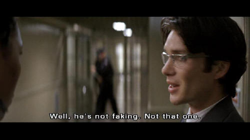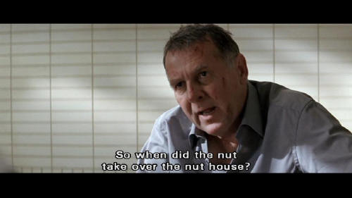 [Falcone] So when did the nut take over the nut house? [Crane] They scream and they cry ... much as you're doing now. [Crane] Well, he's not faking. Not that one. I'll talk to the judge and see if I can get him moved ... to the secure wing at Arkham. I can't treat him here.