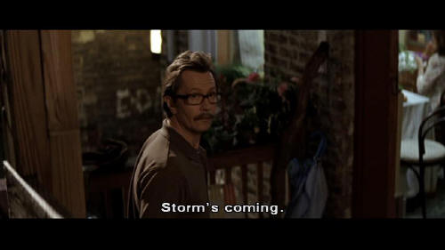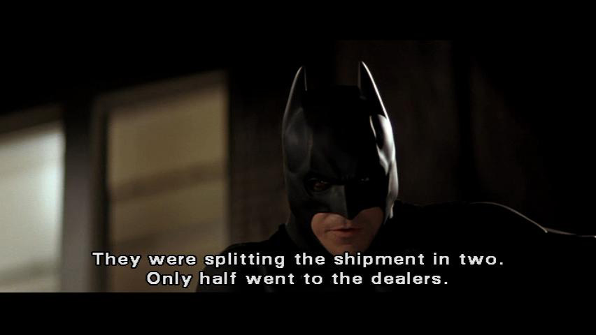 [Batman] Storm's coming. [Gordon] The scum is getting jumpy because you stood up to Falcone. [Batman] It's a start. Your partner was at the docks with Falcone. [Gordon] Well, he moonlights as a low-level enforcer. [Batman] They were splitting the shipment in two. Only half went to the dealers.