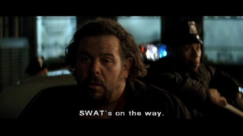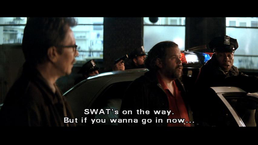 [Flass] What are you waiting for? [Police] Backup. [Flass] Backup? [Police] The Batman's in there. SWAT's on the way. But if you wanna go in now ... I'll be right behind you, sir. [Flass] SWAT's on the way.