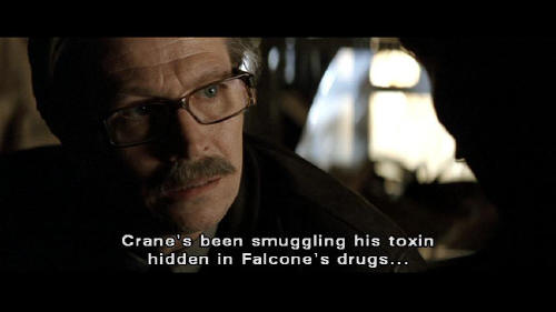 Crane's been smuggling his toxin hidden in Falcone's drugs ... and they're dumping it into the water supply. [Gordon] What was he planning? [Batman] I don't know. [Gordon] Was he working for Falcone? [Batman] He mentioned someone else, someone worse.