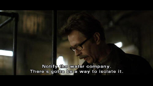 [Gordon] They get any of this crap into the mains? [Technician] Yeah. [Gordon] Notify the water company. There's gotta be a way to isolate it. [Technician] No. They put it all in. They must've been at this for weeks. Gotham's entire water supply is laced with it. [Gordon] Why haven't we felt the effects?