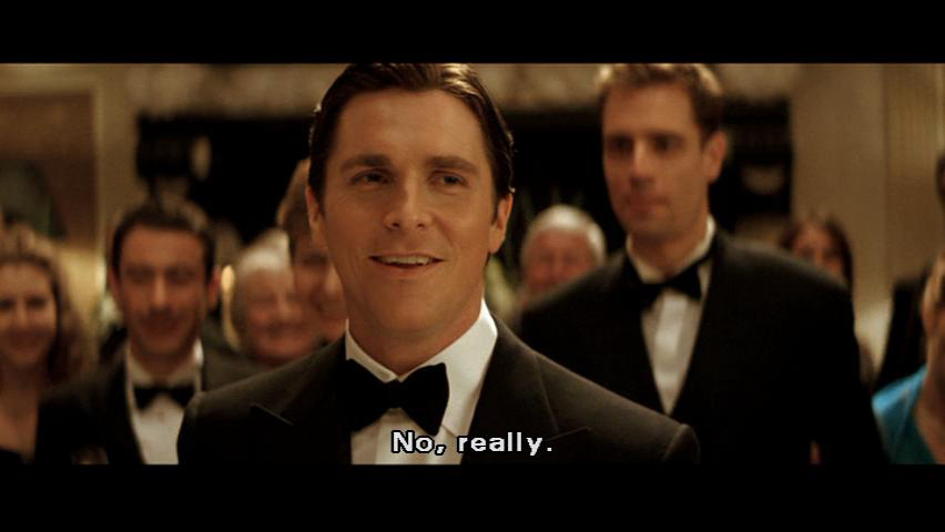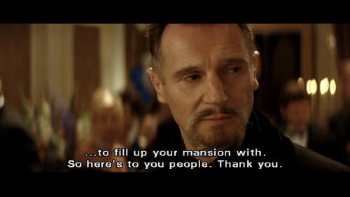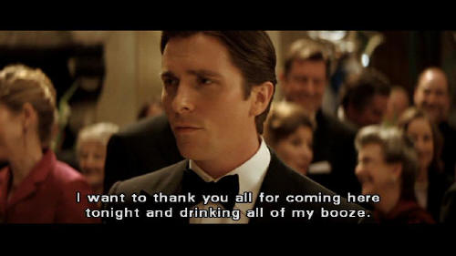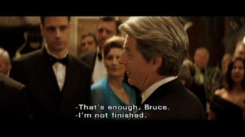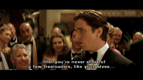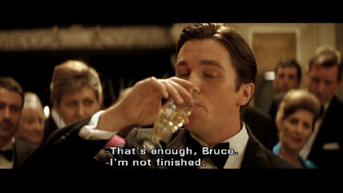 I want to thank you all for coming here tonight and drinking all of my booze. No, really. There's a thing about being a Wayne ... that you're never short of a few freeloaders, like yourselves ... to fill up your mansion with. So here's to you people. Thank you. [Fredericks] That's enough, Bruce. [Bruce] I'm not finished.