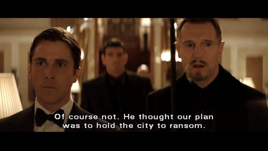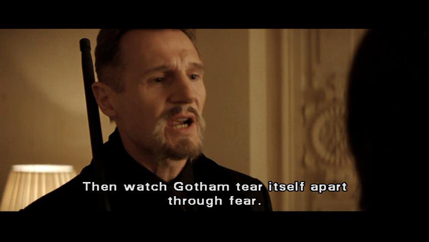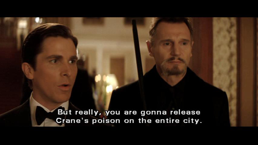 [Henri] Of course not. He thought our plan was to hold the city to ransom. [Bruce] But really, you are gonna release Crane's poison on the entire city. [Henri] Then watch Gotham tear itself apart through fear.