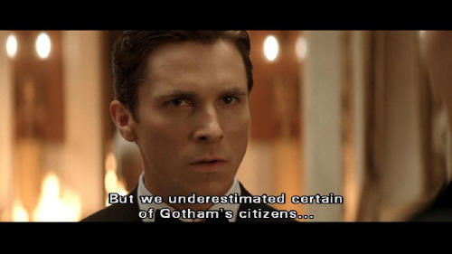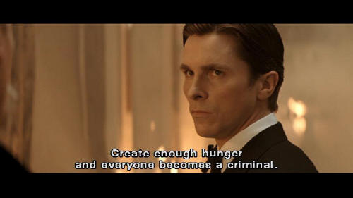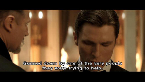 With Gotham we tried a new one. Economics. But we underestimated certain of Gotham's citizens ... such as your parents. Gunned down by one of the very people they were trying to help. Create enough hunger and everyone becomes a criminal. Their deaths galvanized the city into saving itself ... and Gotham has limped on ever since.
