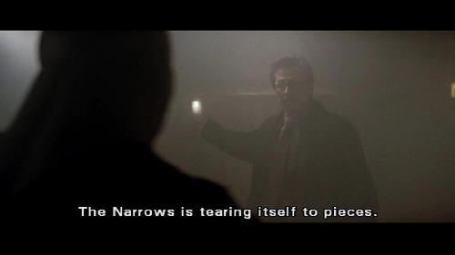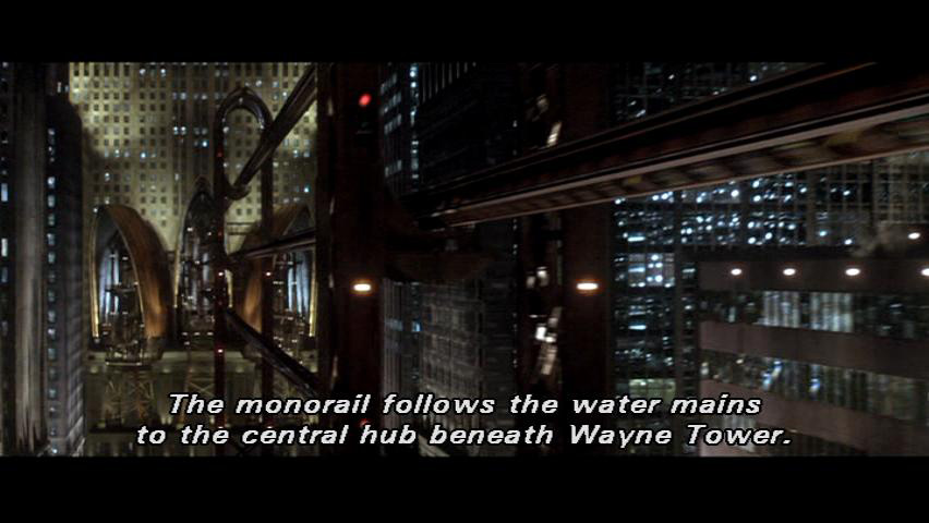 The Narrows is tearing itself to pieces. [Batman] This is just the beginning. If they hit the whole city ... there's nothing to stop Gotham tearing itself apart. [Gordon] How are they gonna do that? [Batman] The train. The monorail follows the water mains to the central hub beneath Wayne Tower.