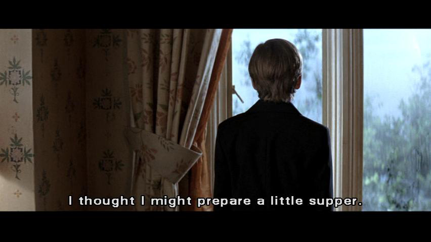 [Alfred] I thought I might prepare a little supper. Very well. [Bruce] Alfred? [Alfred] Yes, Master Bruce? [Bruce] It was my fault, Alfred. I made them leave the theater. [Alfred] No.