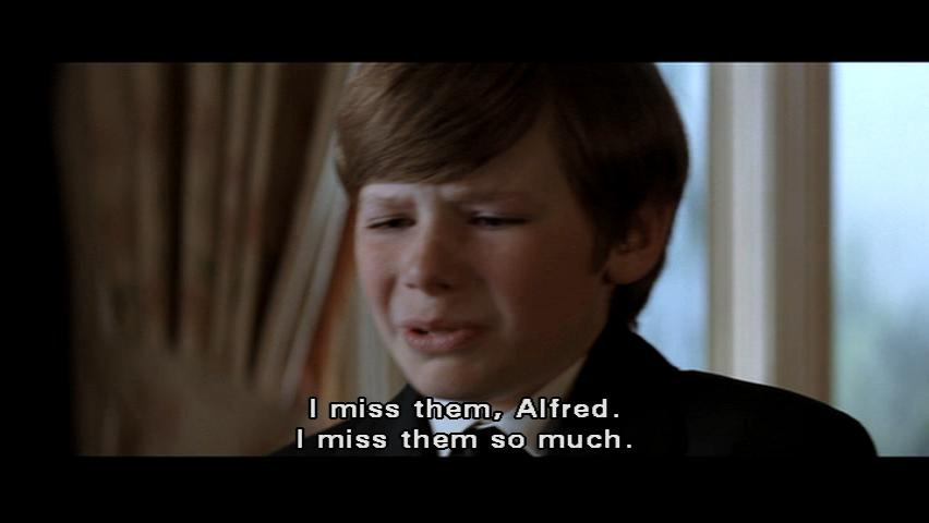 [Bruce] If I hadn't gotten scared ... [Alfred] It was nothing that you did. It was him, and him alone. Do you understand? [Bruce] I miss them, Alfred. I miss them so much. [Alfred] So do I, Master Bruce. So do I.