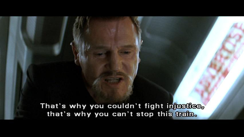 [Gordon] Come on. Come on. [Henri] You are just an ordinary man in a cape. That's why you couldn't fight injustice, that's why you can't stop this train. [Batman] Who said anything about stopping it?