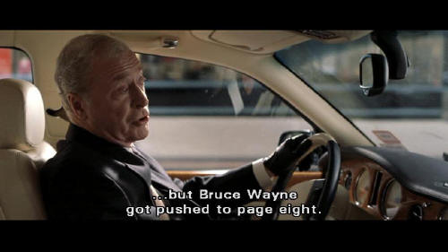 [Alfred] Batman may have made the front page ... but Bruce Wayne got pushed to page eight. Drunken Billionaire Burns Down Home [Bruce] Bruce Wayne. [Earle] What makes you think you can decide who's running Wayne Enterprises?