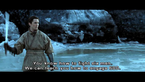 [Henri] And do you still feel responsible for your parents' death? [Bruce] My anger outweighs my guilt. [Henri] Come. You have learned to bury your guilt with anger. I will teach you to confront it and to face the truth. You know how to fight six men. We can teach you how to engage 600.