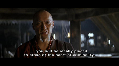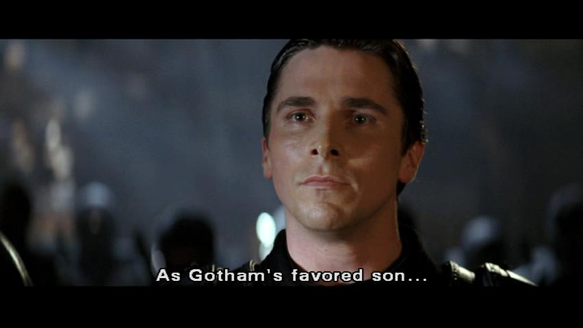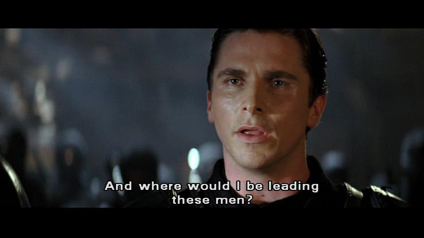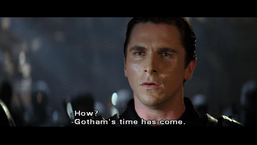 [Ra's al Ghul] You cannot lead these men ... unless you are prepared to do what is necessary to defeat evil. [Bruce] And where would I be leading these men? [Ra's al Ghul] Gotham. As Gotham's favored son ... you will be ideally placed to strike at the heart of criminality. [Bruce] How? [Ra's al Ghul] Gotham's time has come.