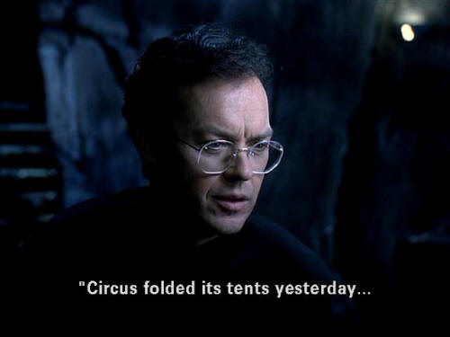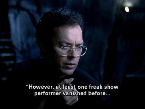 [Bruce] "Featuring a poodle lady ... [Bruce] " ... the world's fattest man ... [Bruce] " ... and Aquatic Bird Boy." [Bruce] "Circus folded its tents yesterday ... [Bruce] " ... after reports of missing children in several towns. [Bruce] "Police have closed down the Red Triangle's fairgrounds. [Bruce] "However at least one freak show performer vanished before ...