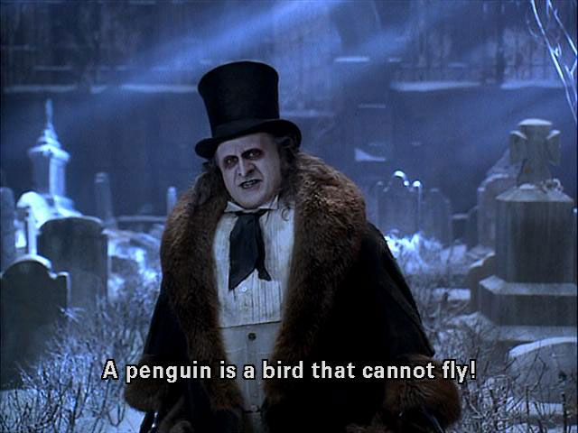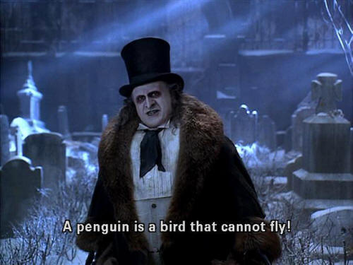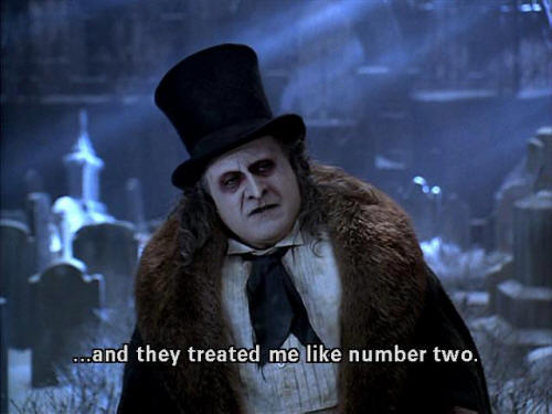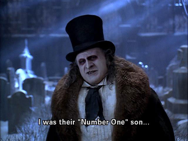 [Penguin] A penguin is a bird that cannot fly! [Penguin] I am a man! [Penguin] I have a name! [Penguin] Oswald Cobblepot! [Reporter] You'll never be able to settle with them? [Penguin] True. [Penguin] I was their "Number One" son ... [Penguin] .. and they treated me like number two.