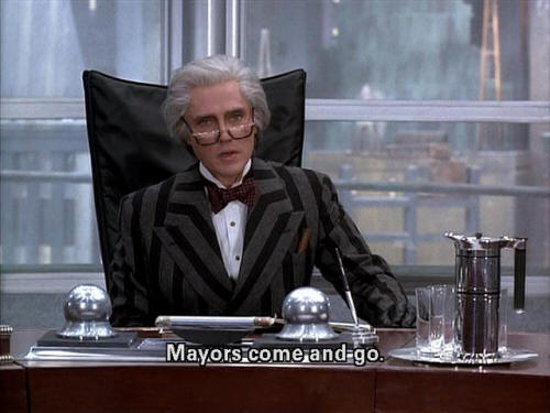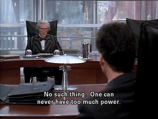[Bruce] Gotham City has a power surplus. I'm sure you know that. [Bruce] My question is .... [Bruce] ... what's your angle? [Shreck] Power surplus? Bruce, shame on you! [Shreck] No such thing. One can never have too much power. [Shreck] If my life has a meaning, that's the meaning. [Bruce] I'll fight you. I've already spoken to the Mayor and we agree. [Shreck] Mayors come and go.