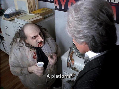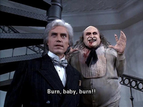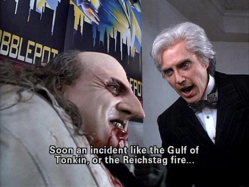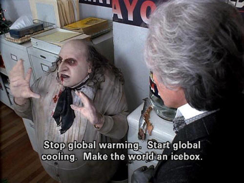 [Penguin] I'd like to fill her void. [Penguin] A platform? [Penguin] Stop global warming. Start global cooling. Make the world an icebox. [Shreck] I like it. But to get the Mayor recalled, we must have a catalyst. [Shreck] Soon, an incident like the Gulf of Tonkin, or the Reichstag fire ... [Shreck] Sidetracked? This is your chance to fulfill a destiny ... [Penguin] Burn, baby, burn!!