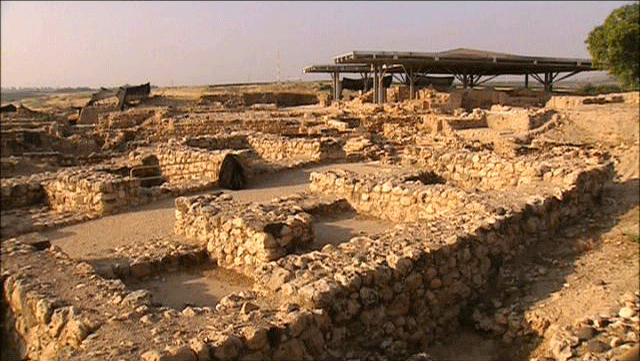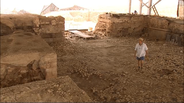 Look at what is happening on the walls. See the ashes? See the wood? Size of the timber? Here. On the walls. Wherever you look, wherever you go, same signs of destruction. [Narrator] These layers of destruction appear to provide tangible evidence of the conquest of Canaan by the armies of Joshua. Given THE MOOD of 1950s Israel, just after the country's independence, this HYPOTHESIS supported the idea that THE BIRTH OF A NATION HAD TO BE PRECEDED BY A MILITARY CONQUEST. [Government Propagandist] "Joshua's destruction of Hazor, the great city of north Canaan referred to in the Bible,