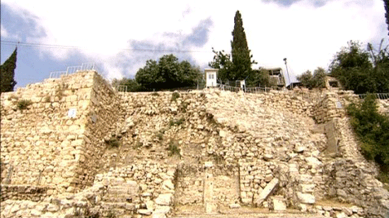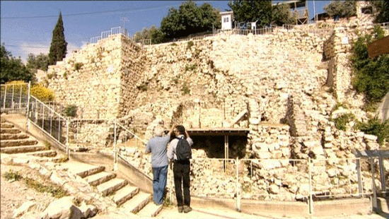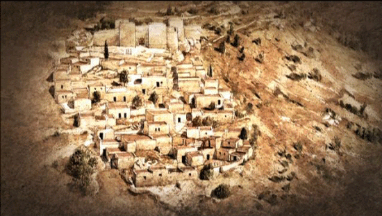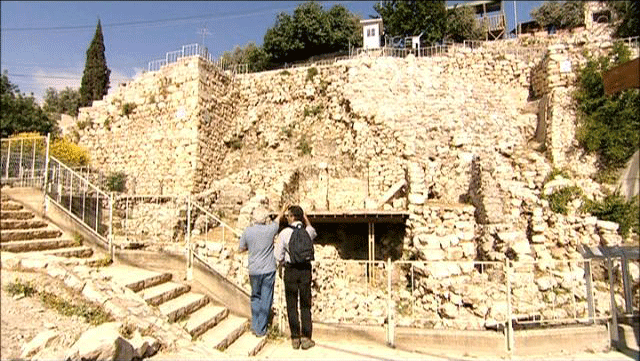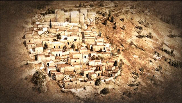 In the late Bronze Age and in the early Iron Age, there is human activity here; there's human occupation here, ON A VERY SMALL SCALE. [Israel Finkelstein] The way I see it, there was a village here in the 10th century, but it was a small one, MAINLY ON THIS PART of the ridge of the city of David, NOT ALL ALONG THE RIDGE, and with a very limited population, NOT FORTIFIED AND WITH NO MONUMENTS. [Ronny Reich, University of Haifa] Well, I agree that it was a very small place. Iron Age Jerusalem was a very small place. And this does not agree -- archaeology and text describe two different natures of sites. Not the existence, but the natures of sites. [Narrator] Unlike the GREAT CITY of the 7th Century, David's [?] Jerusalem was a simple mountain village covering 3-4 hectares.