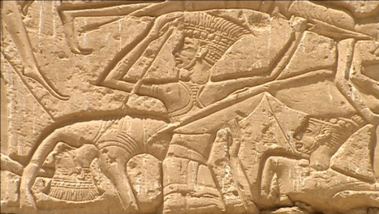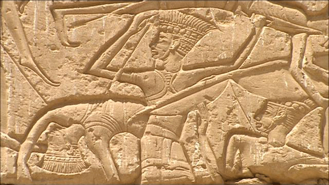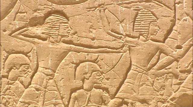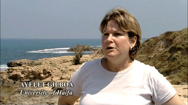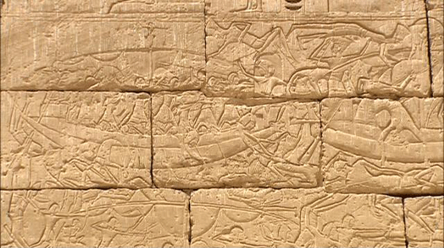 Tel Dor [Ayelet Gilboa, University of Haifa] One of the main [inaudible] outcomes are what we call the movements of the Sea Peoples which are still, after 100 years of research, a very mysterious group of people. Most people think that they came from somewhere in the West -- maybe Greece, maybe Anatolia -- which is West to us -- possibly Cyprus -- and settled in our region on the coast of the Levant. Now among these people, the most celebrated, the most famous ones are the Philistines. We all know the Philistines from the Bible. But there were many groups of Sea People. We know them, name by name, from the Egyptian records -- mainly from the Egyptian records -- and from some Canaanite records, too. Among them -- again there were many -- but were such people as Sikila, Shardana, Lukka, Eqwosh, and many other names which are very hard to define archaeologically. [Narrator] What can we learn from the Canaan and Egyptian sources? In Medinet Habu, in upper Egypt, a monumental inscription dating from Ramesses III, describes attacks carried out by unknown invaders. The carvings show a military campaign and a naval battle: capsized boats, archers, men fallen into the sea. Egypt's adversaries are clearly depicted.