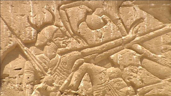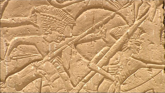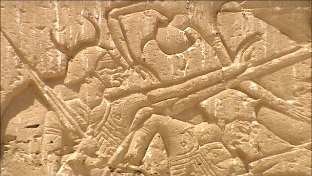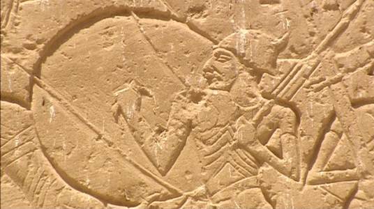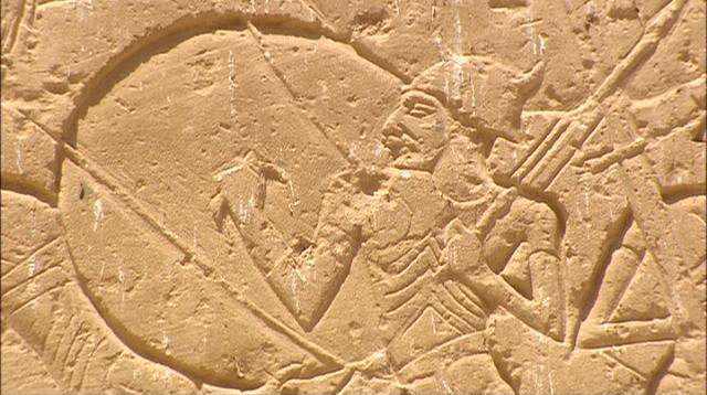 They are wearing plumed helmets with chin-straps, and sometimes strange horned helmets. A visual account of the horrors of a battle. In less than one century -- the 12th -- the Sea Peoples occupied the entire coast. [Israel Finkelstein] It would be a mistake to understand every single destruction of a Canaanite city-state as a result of an attack by the Sea People. The entire eastern Mediterranean was in a complete turmoil. The economy was destructed, maritime trade routes were cut, ports on the Mediterranean coast were destroyed, were attacked and taken. In a situation like this, of economy falling, famine, political dysfunction, then one city can attack another; a gang of people from the highlands can take a city; pastoral nomads can come also and try to gain some advantage by attacking a single city, isolated city. Everything was in chaos. [Narrator] While the city-states were collapsing, one-by-one, another development was secretly unfolding in the highlands.