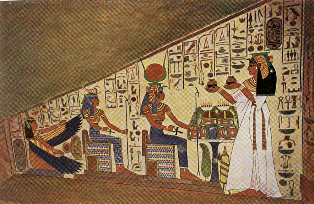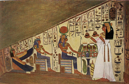 11 - (Thebes) Tomb of Queen Nefertari, wife of Rameses IInd. The queen making an offering to Isis and Nephthys, behind whom is the winged goddess Maat.