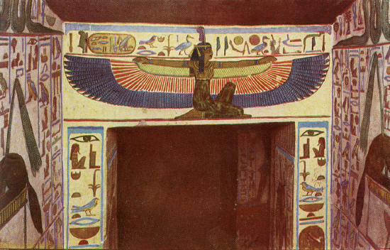 13 - (Thebes) Tomb of Queen Nefertari, wife of Rameses IInd. Maat, the Goddess of Truth, is seen on the architrave of the door of the burial chamber with outstretched wings.
