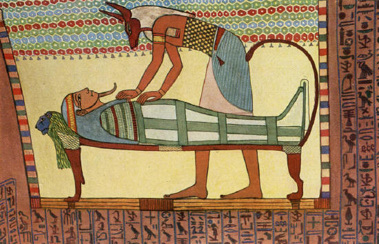 19 - (Thebes) Der el Medineh-Tomb and Mortuary Chapel of the Theban Official Sen-Nezem. -- The embodiment of the body of Sen-Nezem by the God Anubis, whose function was connected with the interment.