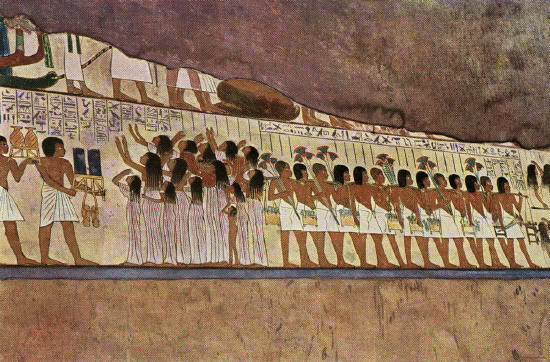 23 - (Thebes) Mortuary Chapels of the Nobles. The Mortuary Chapel of Ramose. Well-grouped women are seen wailing and gesticulating, and a number of servants are bringing offerings of lotus flowers, wine etc. Next there are some more weeping women, from whose eyes the tears flow and in front of them are the yellow and red clad figures of priestesses or funeral dancers.