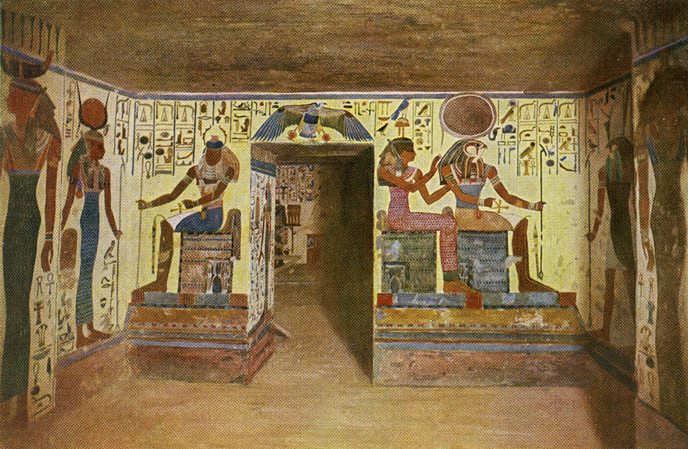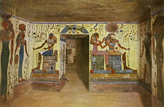 4 - (Thebes) Tomb of Queen Nefertari, wife of Rameses IInd. -- Neith and Selkis the two Goddesses, are both clad in fine red dresses. They are standing to receive the queen as she enters tthe side-chamber. On the right, the queen is seen led by Horus to Harmachis and Hathor, enthroned. On the left Isis leads the queen forward to Khepra -- the beetle-headed God of the Resurrection.