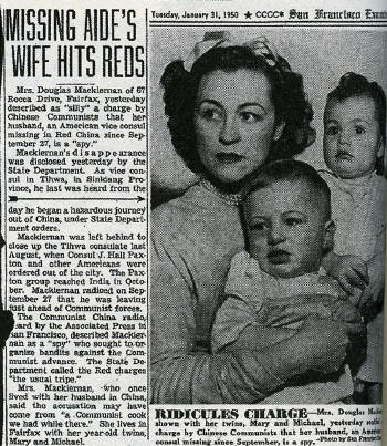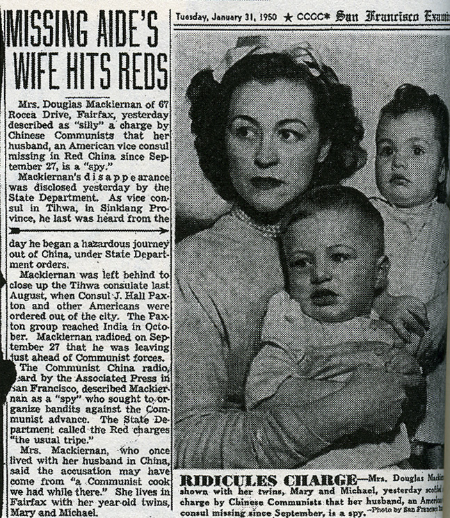 CIA case officer Douglas S. Mackiernan in his jeep in China's far west province of Xinjiang, where he was stationed undercover as a low-level State Department employee. (Courtesy of Pegge Hlavacek) Douglas S. Mackiernan and wife Pegge in New York City's Central Park the winter of 1947-1948. (Courtesy of Pegge Hlavacek) Passport photo of Douglas S. Mackiernan, then working for the CIA undercover as a State Department employee. While others shunned assignment to China's remote far west, he was only too eager to set up a listening post there along the Sino-Soviet border. (Courtesy of Pegge Hlavacek) Douglas S. Mackiernan cradles his newborn son, Michael, in Shanghai in the fall of 1948. It would be the only picture of Mackiernan with his son. Weeks later Pegge and the twins were evacuated. Mackiernan, still posing as a State Department employee, was left behind to gather intelligence on the encroaching Communists. (Courtesy of Pegge Hlavacek) Douglas S. Mackiernan, shirtsleeves rolled up and standing outside the embassy in Tihwa, China. Months later he would be fleeing the Communist Chinese across an endless desert and mountains. (Courtesy of Peggy Hlavacek) Douglas Mackiernan (standing in the middle) against a snowy landscape not unlike that across which he attempted to flee the Communists. He was proud of his new beard and swore he would not take it off until he and wife Pegge were together again. (Courtesy of Peggy Hlavacek) From the San Francisco Examiner, dated January 31, 1950. Mackiernan's widow, Pegge, with twins Mary and Michael, dismissing as "silly" the Chinese claim that her husband had been a spy. Fifty years later the CIA would still not utter his name or acknowledge that he worked for the Agency. (Courtesy of Pegge Hlavacek and the San Francisco Examiner) [RIDICULES CHARGE -- Mrs. Douglas Mackiernan shown with her twins, Mary and Michael, yesterday said charges by Chinese Communists that her husband, an American consul missing since September, is a spy. Mrs. Douglas Mackiernan of 67 Rocca Drive, Fairfax, yesterday described as "silly" a charge by Chinese Communists that her husband, an American vice consul missing in Red China since September 27, is a "spy." Mackiernan's disappearance was disclosed yesterday by the State Department. As vice consul in Tihwa, in Sinkiang Province, he last was heard from the day he began a hazardous journey out of China, under State Department orders. Mackiernan was left behind to close up the Tihwa consulate last August, when Consul J. Hall Paxton and other Americans were ordered out of the city. The Paxton group reached India in October. Mackiernan radioed on September 27 that he was leaving just ahead of Communist forces. The Communist China radio, heard by the Associated Press in San Francisco, described Mackiernan as a "spy" who sought to organize bandits against the Communist advance. The State Department called the Red charges "the usual tripe." Mrs. Mackiernan, who once lived with her husband in China, said the accusation may have come from "a Communist cook we had while there." She lives in Fairfax with her year-old twins, Mary and Michael.] |