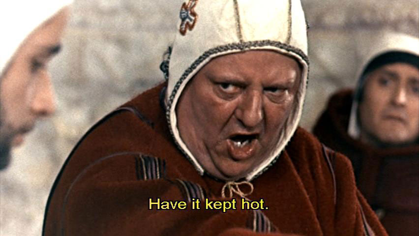 I really believe ... [Bishop Guido] Guards! I've only just got over Lent, and here you all are imposing another on me. [Cleric] But, Your Grace ... [Bishop Guido] Have it kept hot.
